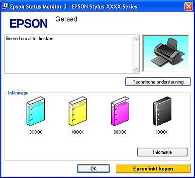 Als een van de cartridges in de printer kapot is, of niet compatibel met het model printer of onjuist geïnstalleerd, kan EPSON StatusMonitor geen nauwkeurige cartridgestatus laten zien. Vervang of herinstalleer een cartridge altijd als EPSON StatusMonitor dat aangeeft.