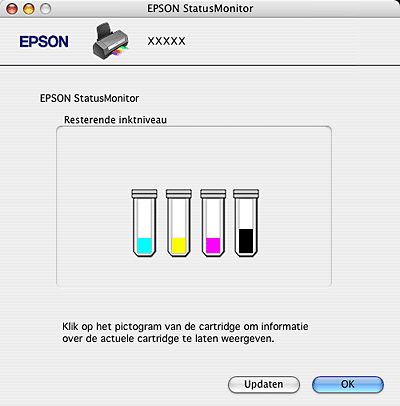 U ziet de cartridgestatus van het moment waarop EPSON StatusMonitor werd geopend. Klik op Updaten als u de cartridgestatus wilt actualiseren.