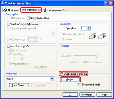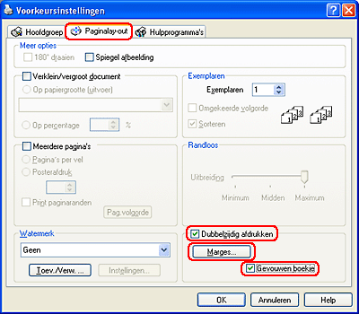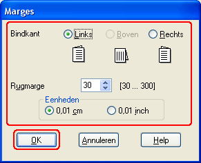 De werkelijke rugmarge kan afwijken van de opgegeven instellingen. Dit hangt af van de toepassing waarmee u werkt. Probeer daarom eerst een paar vellen uit om te zien wat het resultaat zal zijn, voordat u de volledige afdruktaak afdrukt.
