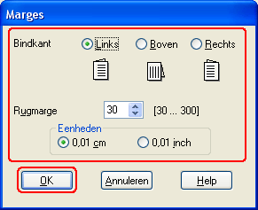 Geef de rand aan waar het papier wordt gebonden. U kunt kiezen uit Links, Boven en Rechts.