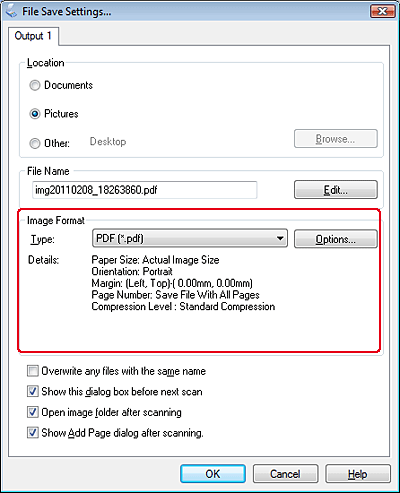 ![]() Zie de Help van Epson Scan voor meer informatie over de andere instellingen in het venster EPSON PDF Plug-in Settings (EPSON PDF Plug-in Instellingen).