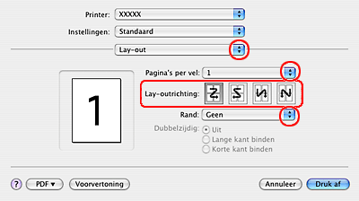 Hiermee worden meerdere pagina's van uw document afgedrukt op één vel papier. U kunt kiezen uit 1, 2, 4, 6, 9 en 16.