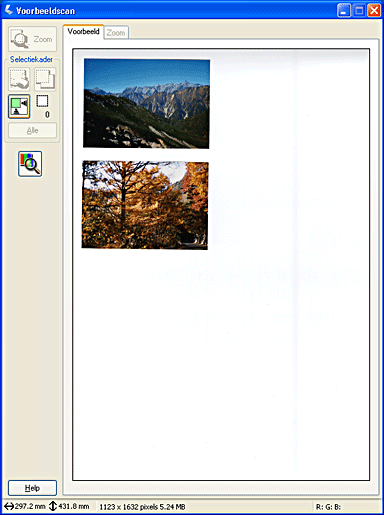 Met een normale voorbeeldscan ziet u het volledige voorbeeld en het resultaat van de instellingen die u hebt vastgelegd. Desgewenst kunt u de instellingen dan aanpassen. Met het selectiekader kunt u precies de gewenste gedeelten van de afbeelding scannen. Zie Een selectiekader gebruiken voor meer informatie over selectiekaders.