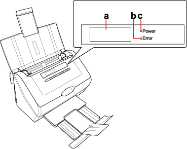 BedieningspaneelOp de scanner vindt u een lcd-scherm, twee indicatielampjes en vier knoppen.