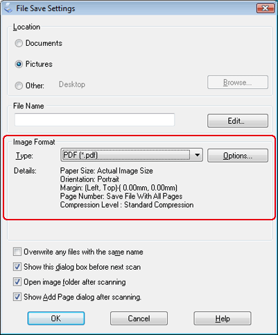 Selecteer de gewenste instellingen voor uw document en klik op OK. U keert terug naar het dialoogvenster File Save Settings (Instellingen voor Bewaar bestand).