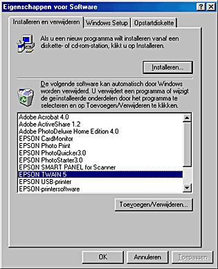 Selecteer EPSON TWAIN 5 uit de lijst en klik op Toevoegen/Verwijderen (Add/Remove).