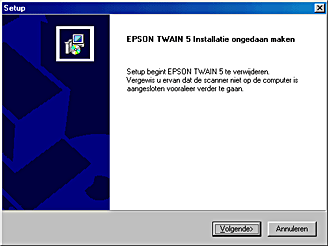 Ook het dialoogvenster van het EPSON-installatieprogramma biedt een optie voor het verwijderen van EPSON TWAIN. U kunt dit dialoogvenster openen door de cd-rom met de scannersoftware in de cd-rom-lezer te plaatsen.