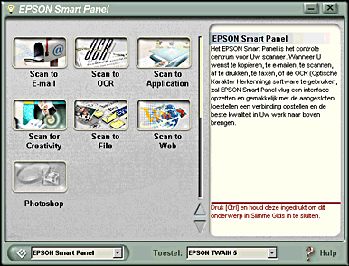 Selecteer een toepassing in de keuzelijst EPSON Smart Panel of klik op de knop Start in de linkerbenedenhoek.