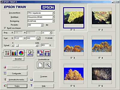 Gebruik deze methode voor het scannen van transparante materialen. Bij gebruik van het thumbnailvoorbeeld zoekt EPSON TWAIN automatisch de precieze locatie van de verschillende opnamen van de film, wordt de functie Automatische belichting toegepast op elke afzonderlijke opname en worden alle opnamen vervolgens weergegeven als miniatuurafbeelding.
