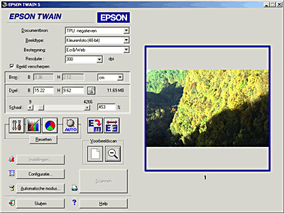 Wanneer in het dialoogvenster Configuratie het selectievakje Automatische voorbeeldscan is ingeschakeld, wordt automatisch een voorbeeldscan weergegeven nadat EPSON TWAIN is gestart. Zie Configuratie-instellingen vastleggen.