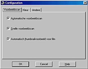 Wanneer u in het venster van de manuele modus op de knop Configuratie klikt, wordt het dialoogvenster Configuratie geopend. Hierin kunt u tal van configuratie-instellingen aanpassen voor het Voorbeeldscan-venster, de voorbeeldscan en de kleuraanpassing.