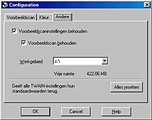 Wanneer deze optie is ingeschakeld, wordt de in het Voorbeeldscan-venster getoonde afbeelding samen met de bijbehorende instellingen opgeslagen, zodat deze instellingen automatisch weer van toepassing zijn wanneer EPSON TWAIN opnieuw wordt gestart. Dit is handig wanneer hetzelfde document meer dan eens wordt gescand, en met name wanneer het document wordt gescand met verschillende TWAIN-toepassingen.