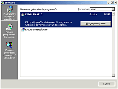 Ga als volgt te werk om EPSON TWAIN te verwijderen. Voor gebruikers van Windows Me of 98, zie Voor gebruikers van Windows Me of 98. Voor gebruikers van Windows 2000, zie Voor gebruikers van Windows 2000.