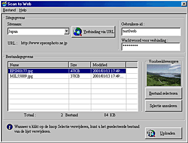 Met deze toepassing kunt u een afbeelding scannen en verzenden naar de EPSON-website voor het delen van foto's. Wanneer u deze toepassing start, wordt een afbeelding gescand met behulp van EPSON TWAIN en weergegeven in het dialoogvenster Verify Assistant. Klik op Finish en het volgende dialoogvenster wordt weergegeven. Klik op Uploaden om de afbeelding te verzenden. Raadpleeg de documentatie bij EPSON Smart Panel voor meer informatie.