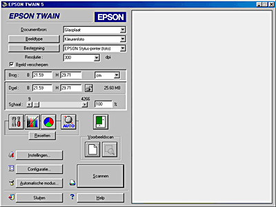In het Voorbeeldscan-venster wordt een voorbeeld van de scan getoond. Wanneer in het dialoogvenster Configuratie het selectievakje Automatische voorbeeldscan is ingeschakeld, wordt automatisch een voorbeeldscan weergegeven nadat EPSON TWAIN is gestart. Zie Configuratie-instellingen vastleggen.