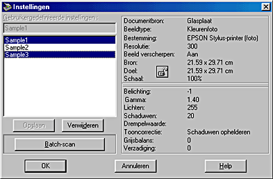 Als u één afbeelding wilt scannen met uiteenlopende instellingen, maak dan eerst alle verschillende groepen met instellingen en sla ze op zoals hiervoor beschreven. Houd nu Ctrl ingedrukt en klik op alle gewenste aangepaste instellingen in de keuzelijst Gebruikergedefinieerde instellingen om ze te selecteren. Wanneer u alle instellingen waarmee u wilt scannen hebt geselecteerd, klikt u op de knop Batch-scan. De afbeelding wordt nu apart gescand voor elke groep instellingen die u hebt geselecteerd.