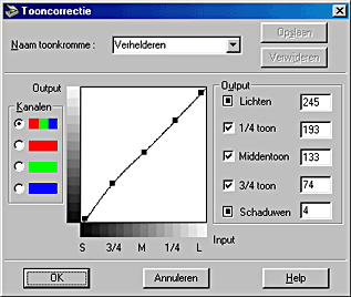 Met de functie Tooncorrectie beschikt u over voorgedefinieerde tooncorrectiekrommen waarmee u het contrast van een afbeelding kunt aanpassen. Wanneer u deze functie gebruikt in combinatie met de instellingen in het dialoogvenster Beeldbewerking, krijgt u meer controle over de afbeelding.