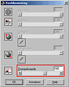 ![]() | Wijzig de drempelwaarde met behulp van de schuifbalk Drempelwaarde. Bekijk het resultaat van uw wijzigingen in het Voorbeeldscan-venster. Het aanpassen van de drempelwaarde kan de tekstherkenning gemakkelijker maken. |