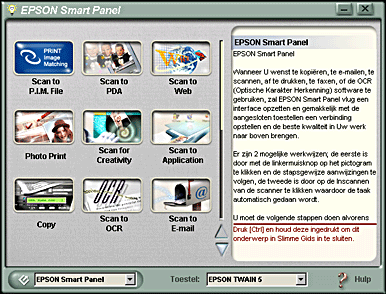 Met EPSON Smart Panel kunt u afbeeldingen scannen en rechtstreeks versturen naar een toegewezen toepassing, de EPSON-website voor het delen van foto's of uw PDA. Ook kunt u snel en eenvoudig foto's en documenten in digitale vorm omzetten.