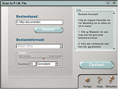 Met deze toepassing kunt u afbeeldingen scannen, omzetten en vervolgens opslaan in een specifieke map. Wanneer u deze functie gebruikt, wordt de afbeelding gescand onder EPSON TWAIN en weergegeven in het dialoogvenster Verify Assistant. Als u op Opslaan klikt, verschijnt het volgende dialoogvenster. Raadpleeg de documentatie bij EPSON Smart Panel voor meer informatie.