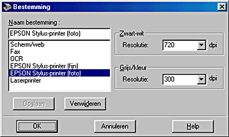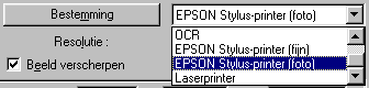 Als u een EPSON Stylus-printer gebruikt en gescande afbeeldingen wilt afdrukken met in uw printersoftware de instellingen voor zuinig, normaal of fijne afdrukkwaliteit geselecteerd, raden wij u aan om de optie EPSON Stylus-printer (fijn) te selecteren. Als u afdrukt met de instelling superfijn of fotokwaliteit, selecteert u EPSON Stylus-printer (foto).