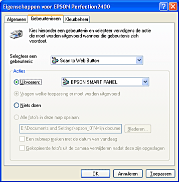 Onder Windows kunt u behalve EPSON Smart Panel elke gewenste toepassing die scannergebeurtenissen ondersteunt (zoals Imaging voor Windows, als dit tenminste is geïnstalleerd) aan de knoppen op de scanner toewijzen. Wanneer u op de knop