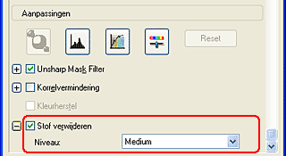 Schakel het selectievakje Stof verwijderen in. (Schuif door naar het onderste deel van het scherm, indien nodig.) In de thuismodus vindt u het selectievakje Stof verwijderen in het dialoogvenster Beeldaanpassing.