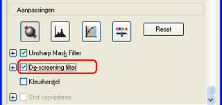 Schakel in het gedeelte Aanpassingen het Descreening-filter in. (Schuif door naar het onderste deel van het scherm, indien nodig.) In de thuismodus vindt u het selectievakje Descreening-filter in het dialoogvenster Beeldaanpassing.