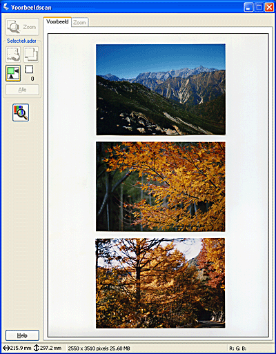 Met een miniatuurvoorbeeld kunt u een voorbeeldscan bekijken van meerdere afbeeldingen in het klein. EPSON Scan lokaliseert automatisch de verschillende opnamen en past de functie Automatische belichting toe op elke afzonderlijke opname. U kunt elke afbeelding afzonderlijk wijzigen en tal van overige aanpassingen doorvoeren. Met het selectiekader kunt u precies de gewenste gedeelten van de afbeelding scannen. Zie Een selectiekader gebruiken voor meer informatie over selectiekaders.