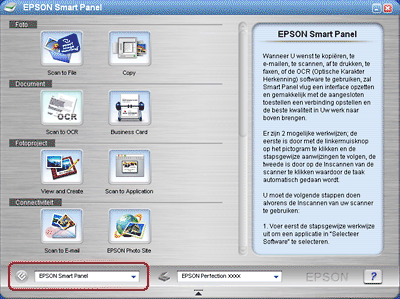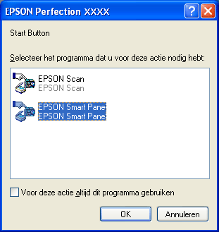 op de scanner drukt, wordt standaard EPSON Smart Panel gestart. In het venster EPSON Smart Panel kunt u zelf de gewenste toepassing toewijzen aan de knop Start