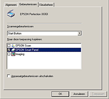 Onder Windows kunt u behalve EPSON Smart Panel elke gewenste toepassing die scannergebeurtenissen ondersteunt (zoals Imaging voor Windows, als dit is geïnstalleerd) aan de knoppen op de scanner toewijzen. Wanneer u op de knop Start