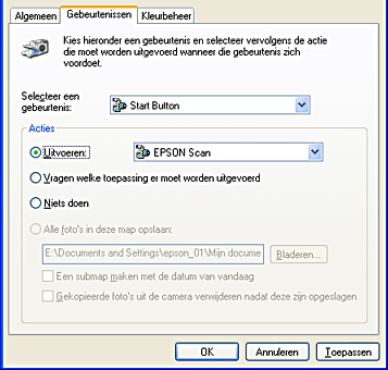 Als u Scannergebeurtenissen wilt uitschakelen, selecteert u Niets doen (Take no action) in het dialoogvenster Eigenschappen (Properties) van de scanner.