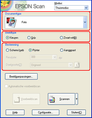 ![]() | In het hoofdvenster van EPSON Scan geeft u instellingen op voor het Documenttype, Beeldtype en de Bestemming. |