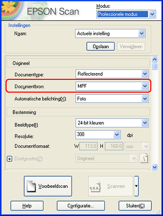 ![]() | Controleer in het hoofdvenster van EPSON Scan of Fototoevoer is geselecteerd als documentbron. Kies vervolgens de gewenste scaninstellingen. |