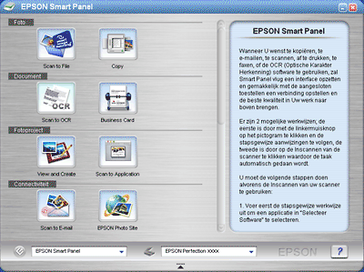 Met EPSON Smart Panel kunt u afbeeldingen scannen en rechtstreeks versturen naar een toegewezen toepassing of de EPSON-website voor het delen van foto's. Ook kunt u snel en eenvoudig foto's en documenten in digitale vorm omzetten.