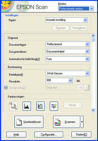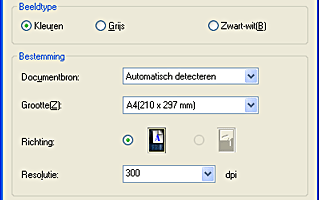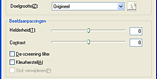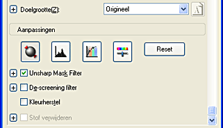 Geef het uitvoerformaat van de gescande afbeelding op bij Doelgrootte en voer eventueel aanpassingen door met de diverse beeldbewerkingsfuncties.