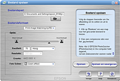 Met deze toepassing kunt u een afbeelding scannen en converteren met de standaard PRINT Image Matching en de gescande afbeelding vervolgens opslaan in een specifieke map. Ook is het mogelijk om diverse kleureffecten toe te passen op de scan. Wanneer u deze toepassing start, wordt de afbeelding gescand onder EPSON Scan en weergegeven in het dialoogvenster Verify Assistant. Klik op Volgende en het volgende dialoogvenster verschijnt.