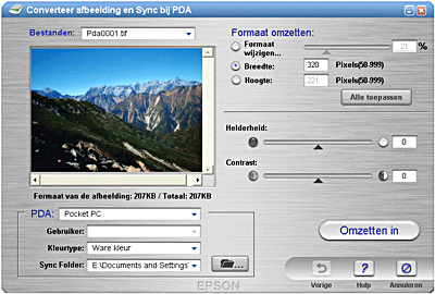 Met deze toepassing kunt u een afbeelding scannen en converteren naar een bestandsindeling die geschikt is voor PDA. Wanneer u deze toepassing start, wordt de afbeelding gescand onder EPSON Scan en weergegeven in het dialoogvenster Verify Assistant. Klik op Volgende en het volgende dialoogvenster verschijnt. Klik op Omzetten in om de afbeelding te exporteren naar de map Sync of de opgegeven map.