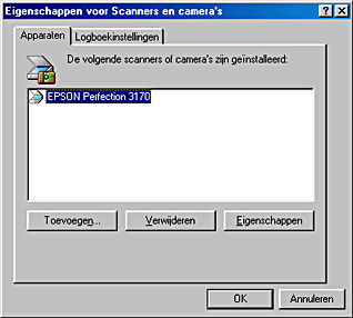 Selecteer uw scanner in de lijst met geïnstalleerde scanners en camera's. Klik op Eigenschappen (Properties).