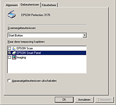 Onder Windows kunt u behalve EPSON Smart Panel elke gewenste toepassing die scannergebeurtenissen ondersteunt (zoals Imaging voor Windows, als dit tenminste is geïnstalleerd) aan de knoppen op de scanner toewijzen. Wanneer u op de knop Start