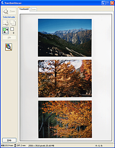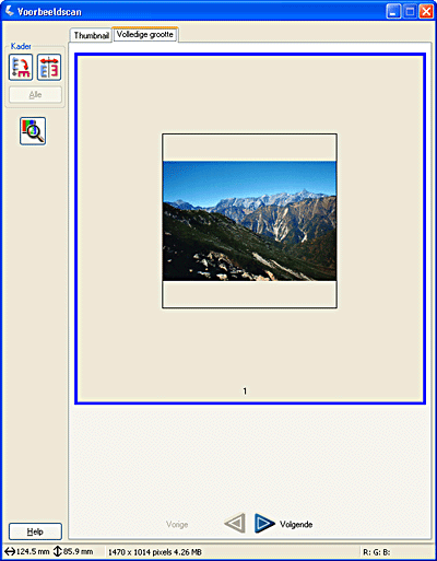 Met een normale voorbeeldscan ziet u het volledige voorbeeld en het resultaat van de instellingen die u hebt vastgelegd. Desgewenst kunt u de instellingen dan aanpassen. Met het selectiekader kunt u precies de gewenste gedeelten van de afbeelding scannen. Zie Een selectiekader gebruiken voor meer informatie over selectiekaders.