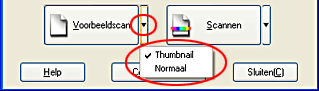 Wanneer u op de knop Voorbeeldscan klikt, wordt de voorbeeldscan gemaakt en weergegeven in het daarvoor bestemde venster. Afhankelijk van de gekozen modus en de instellingen bij Documenttype staat er een klein pijltje rechts naast de knop Voorbeeldscan. Via dat pijltje bepaalt u op welke manier de voorbeeldscans moeten worden gemaakt. Klik op de pijl en selecteer Thumbnail of Normaal.