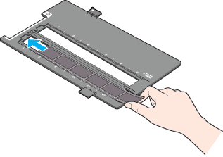 Steek de rand van de strook in de filmhouder voor 35-mm-film, met de basiszijde naar beneden. Breng de gewenste opname precies in de houder.
