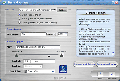 Met deze toepassing kunt u afbeeldingen scannen, omzetten en vervolgens opslaan in een specifieke map. Ook is het mogelijk om een afbeelding te converteren met PRINT Image Matching en diverse kleureffecten toe te passen op de scan. Wanneer u deze toepassing start, verschijnt het volgende venster. Geef de juiste instellingen op en klik op Scan and Save. De afbeelding wordt gescand via EPSON Scan.