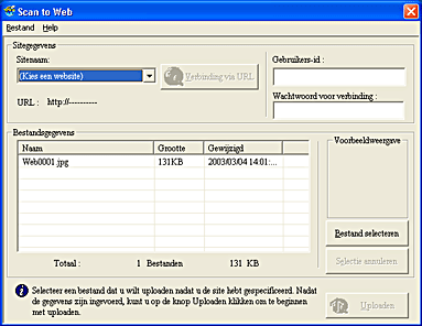 Met deze toepassing kunt u een afbeelding scannen met de technologie PRINT Image Matching en deze vervolgens versturen naar de EPSON-website voor het delen van foto's. Wanneer u deze toepassing start, wordt de afbeelding gescand onder EPSON Scan en weergegeven in het dialoogvenster Verify Assistant. Klik op Volgende en het volgende dialoogvenster verschijnt. Klik op Uploaden om de afbeelding te versturen.