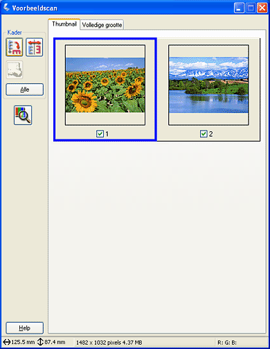 Met een miniatuurvoorbeeld kunt u een voorbeeldscan bekijken van meerdere afbeeldingen in het klein. EPSON Scan lokaliseert automatisch de verschillende opnamen en past de functie Automatische belichting toe op elke afzonderlijke opname. U kunt elke afbeelding afzonderlijk wijzigen en tal van overige aanpassingen doorvoeren.