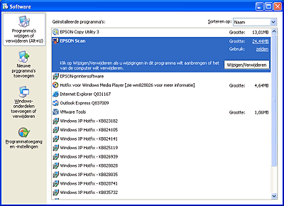 ![]() | Selecteer EPSON Scan in de lijst en klik vervolgens op Wijzigen/Verwijderen (Change/Remove) (Windows XP of 2000) of Toevoegen/Verwijderen (Add/Remove) (Windows Me of 98 Tweede Editie). |