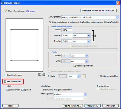 Schakel het selectievakje Meer opties tonen in en selecteer Als bron als instelling bij Afdrukgebied.