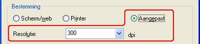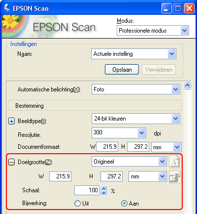 Instellingen voor de Bestemming. Aan de hand hiervan weet Epson Scan wat u met de gescande afbeelding wilt doen, zodat de juiste resolutie (scankwaliteit) daarop kan worden afgestemd.