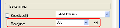 Als u de afbeeldingen later wilt vergroten in een beeldbewerkingsprogramma, moet u de instelling bij Resolutie verhogen. Alleen op die manier kan de hoge beeldkwaliteit behouden blijven na het vergroten. Verhoog de resolutie overeenkomstig de vergroting van het beeldformaat. Als de resolutie bijvoorbeeld 300 dpi (dots per inch) bedraagt en u wilt de afbeelding 200% vergroten in een beeldbewerkingsprogramma, dan moet u de Resolutie in Epson Scan op 600 dpi zetten. Klik op de pijl van de keuzelijst Resolutie en selecteer het aantal dots per inch waarmee moet worden gescand. Zie de onderstaande tabel voor enkele richtlijnen.